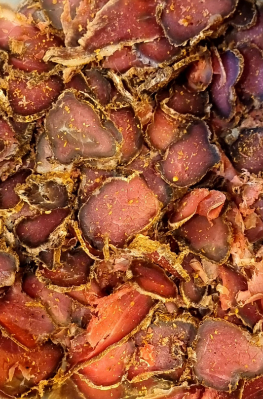 Hand-cut slices of traditional beef biltong. No shortcuts, no nasties, just time-honoured South African craftsmanship.