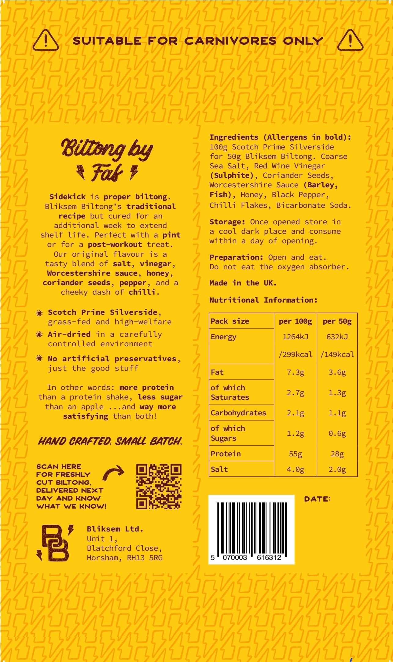Sidekick is proper biltong. Bliksem Biltong's traditional recipe but cured for an additional week to extend shelf life. Perfect with a pint or for a post-workout treat. Our original flavour is a tasty blend of salt, vinegar. Worcestershire sauce. honey, coriander seeds, pepper and a cheeky dash of chilli.